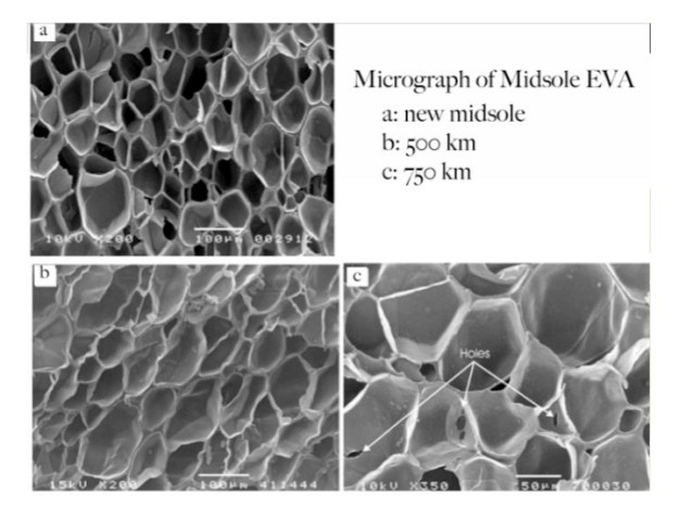 As you run, you are applying mechanical forces to the shoe itself. These forces physically break down the midsole. In fact, lets look at this at the microscopic level. The following picture is from a study (1) that looked at the state of the midsole at various points in the shoe’s lifespan. In fig A, you are looking at an electron micrograph cross section of a brand new shoe. It’s easy to see the outline of the well defined air pockets in the midsole. This intact formation allows the midsole to perform as it was designed. Fig B shows a cross section of the midsole after 500 kilometers (310 mi). This type of magnification allows you to see that the edges of the former well defined air pockets are now frayed and weakened. Finally, Fig C shows the midsole after 750 Kilometers (466 mi). It is now possible to see that the majority of the air pores are frayed, and in fact some of them have actually deformed enough to create holes. Thus, the structural properties of this midsole material are now very different from what they originally were when new. While your body can repair tissues that have been affected from mechanical stresses in running, your shoes cannot. Resting your shoes by the front door between runs won’t reverse these changes.