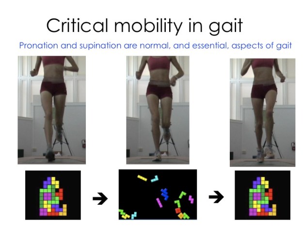 1 – First, let’s re-cap what this pronation stuff is all about. Pronation is not bad; in fact, it’s the body’s natural shock absorption mechanism. When the foot moves into pronation, it becomes like a loose bag of bones. Everyone pronates to some extent. Some more than others.  If you didn’t pronate, you’d have problems with- you guessed it- shock absorption. The opposite of pronation is supination. In supination the bones of the foot become more congruent (increased contact between the surfaces of the joints). This increased contact produces a rigid lever for push off in gait. So we should land in a supinated position, and move to a more pronated position during stance to decrease shock, and then move to a supinated position to achieve a rigid lever for push off.